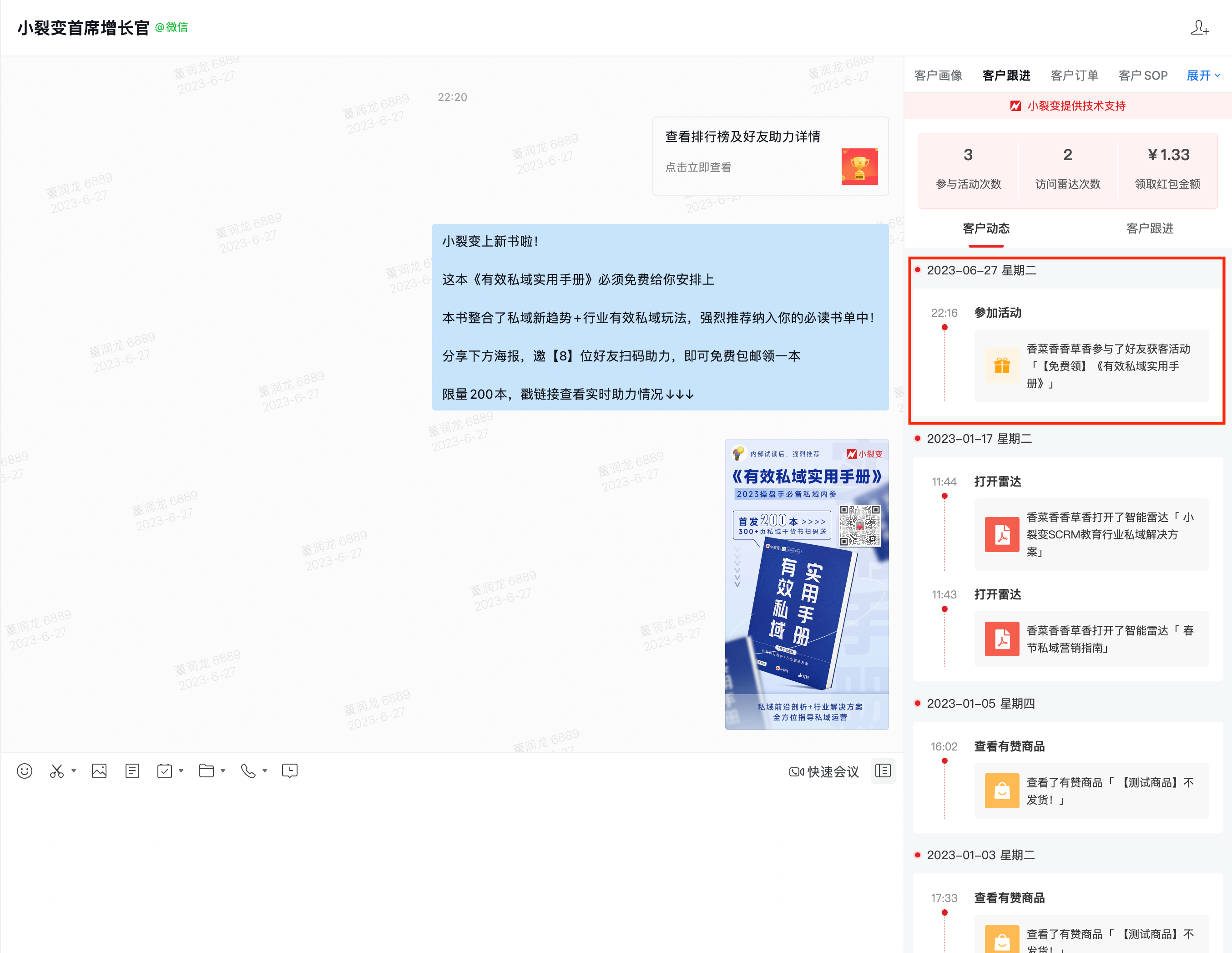 客戶(hù)通過(guò)員工的專(zhuān)屬渠道參與活動(dòng),會(huì)自動(dòng)記錄在客戶(hù)動(dòng)態(tài)中,方便成員后期了解客戶(hù)歷史行為,針對(duì)性服務(wù)客戶(hù)