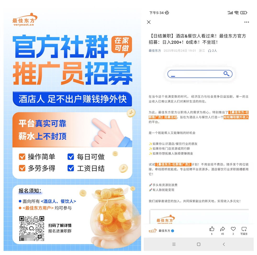 一方面,最佳東方通過社交媒體平臺、行業(yè)社群等渠道發(fā)布高質(zhì)量的招聘資訊、行業(yè)動態(tài)、求職技巧、干貨資料,例如酒店業(yè)/餐飲業(yè)人力資源白皮書、深度行業(yè)報告、崗位分析等內(nèi)容,精準吸引潛在用戶關注,并引導他們加入私域社群。