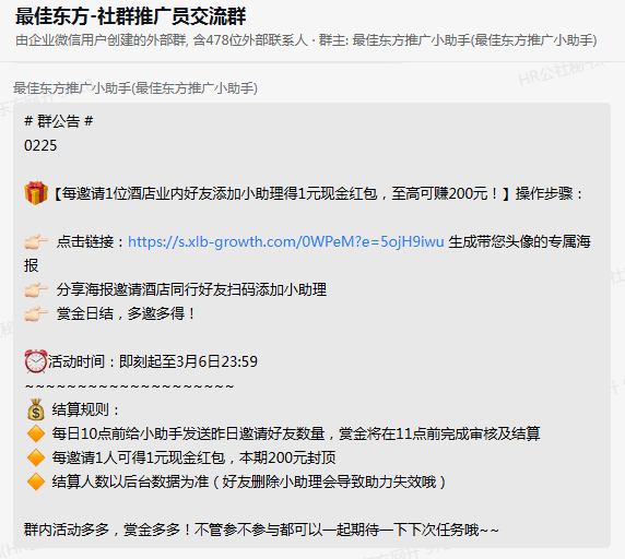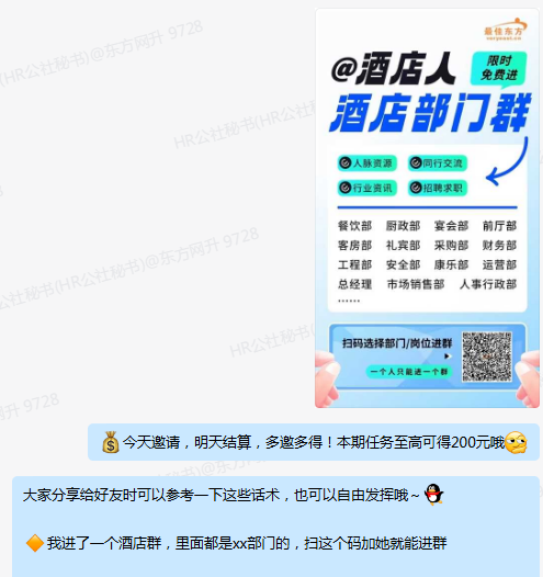 其次,活動分享切入點堅持“利他”,讓看到推廣信息的好友覺得這個信息是對他有利的,讓好友能進入到高質(zhì)量的酒店部門群、崗位需求群,幫助推廣更輕松完成招募任務。
