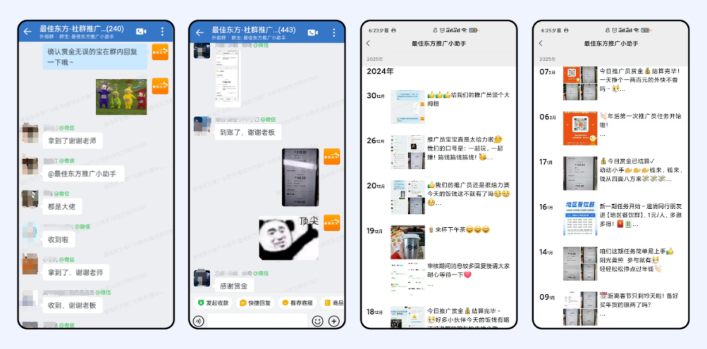 因此,每次結算賞金,最佳東方都會在開始結算、結算中、結算完成每一個環(huán)節(jié)做好互動儀式感,讓每一筆費用結算在社群內(nèi)有曝光,并引導拿到賞金的推廣員在群內(nèi)反饋,營造一個積極向上的“做任務能賺錢”的群氛圍。