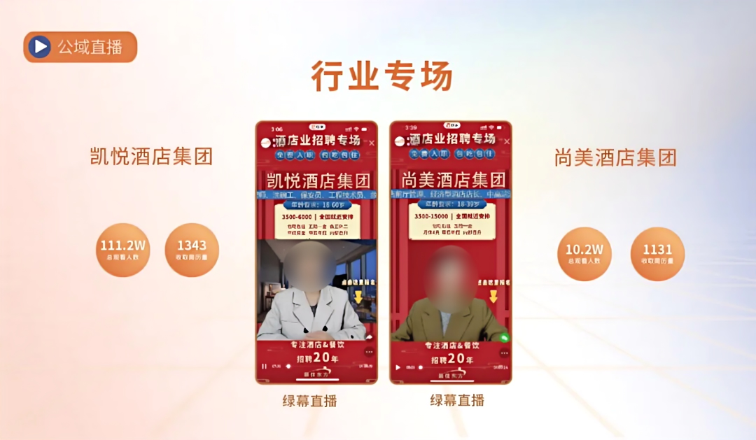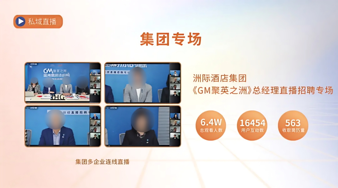 最佳東方聯(lián)動洲際酒店等頭部酒店(集團)、行業(yè)企業(yè)發(fā)起“直播招聘專場”公私域直播,吸引最佳東方私域和視頻號直播公域酒店行業(yè)從業(yè)者觀看直播。
