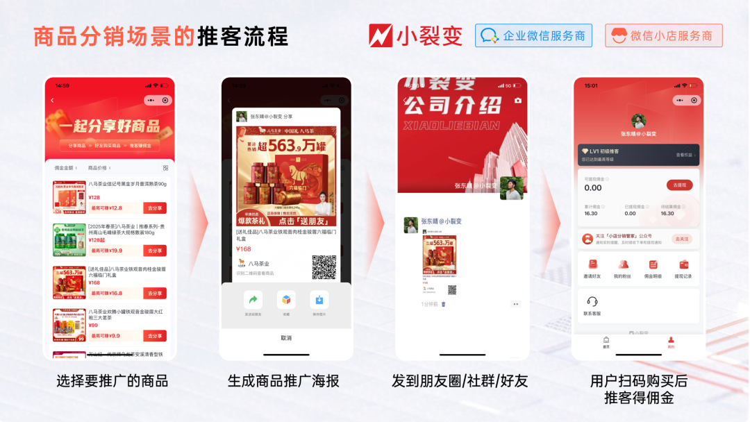 淘寶客、私域團(tuán)長等機(jī)構(gòu)接入小裂變·推客分銷系統(tǒng)后,可招募推客參與帶貨(分銷),推客將商品海報/詳情/鏈接、直播間、短視頻等分享至朋友圈/社群/好友,好友下單且訂單完成后,推客可獲得傭金。