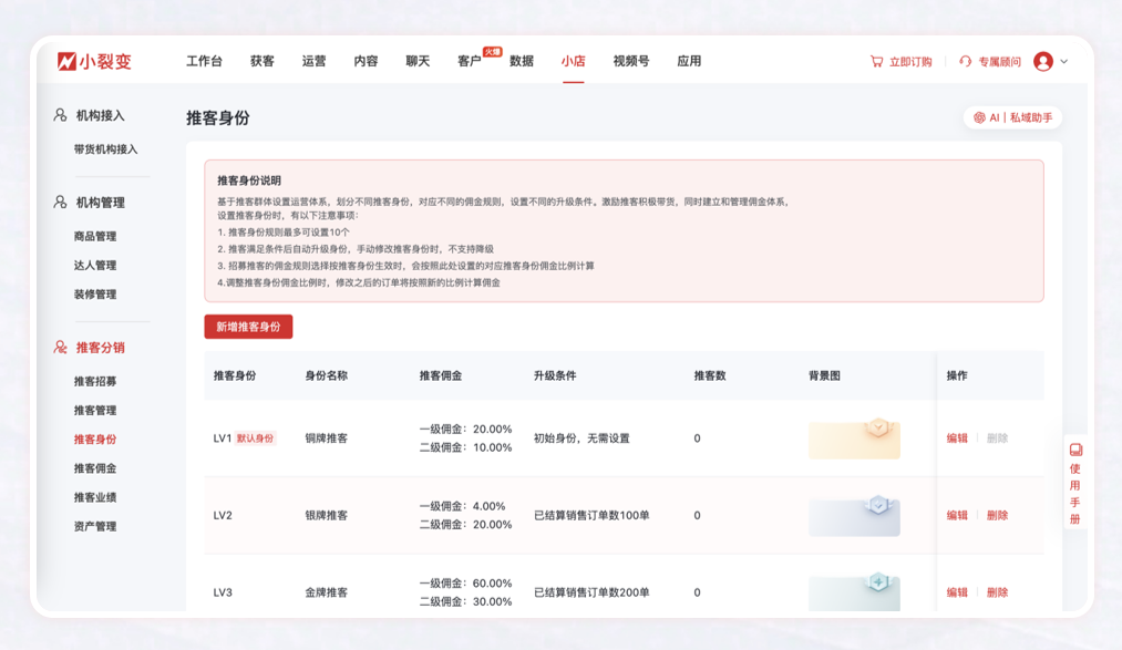 推客身份:可建立靈活的推客運(yùn)營激勵體系,支持自定義推客身份,按不同的推客身份設(shè)置不同權(quán)益和傭金,驅(qū)動推客招募新推客并帶來新訂單。