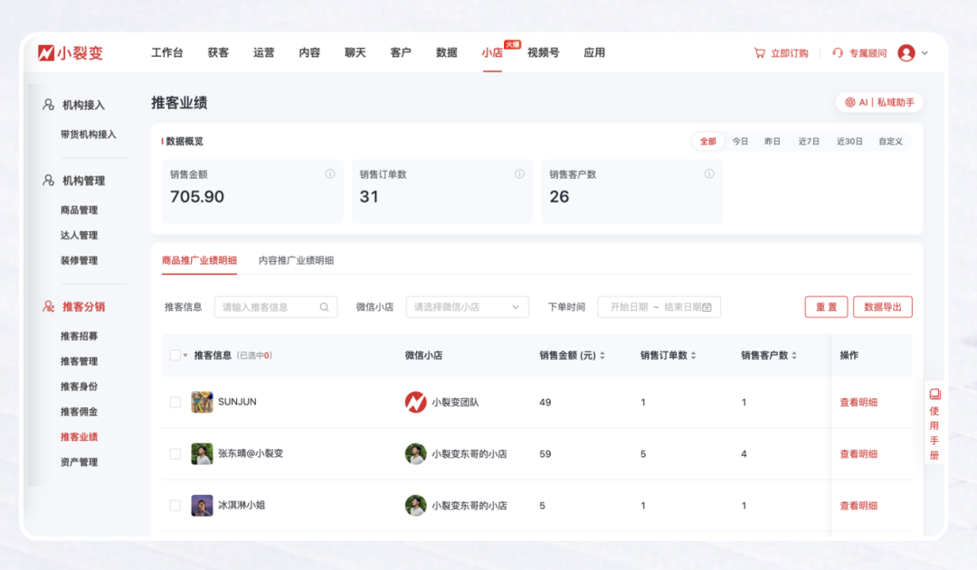 通過小裂變·推客分銷系統(tǒng),帶貨機(jī)構(gòu)可根據(jù)推客傭金發(fā)放情況和推客業(yè)績,篩選出帶貨能力強(qiáng)的推客。