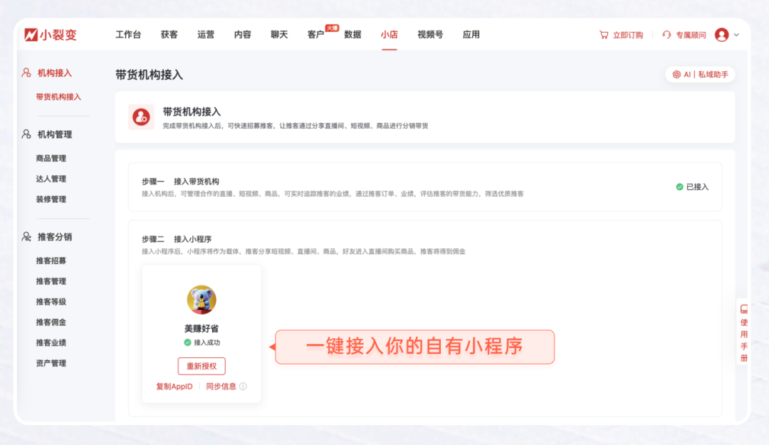 帶貨機(jī)構(gòu)接入小裂變·推客分銷系統(tǒng),僅需完成接入帶貨機(jī)構(gòu)接入小程序兩個步驟。