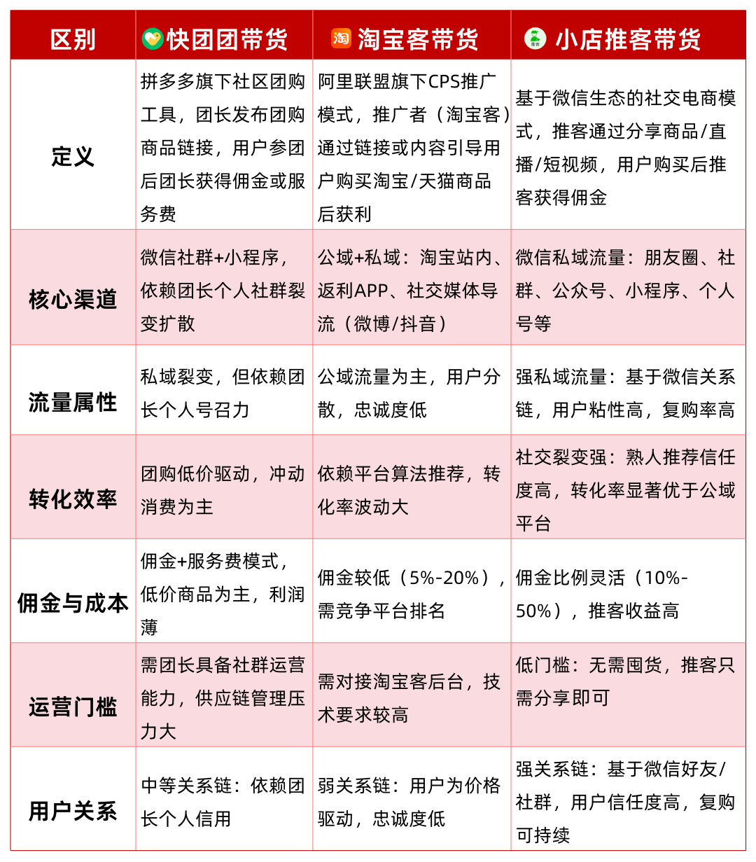 1)私域團(tuán)長帶貨、淘寶客帶貨VS小店推客帶貨