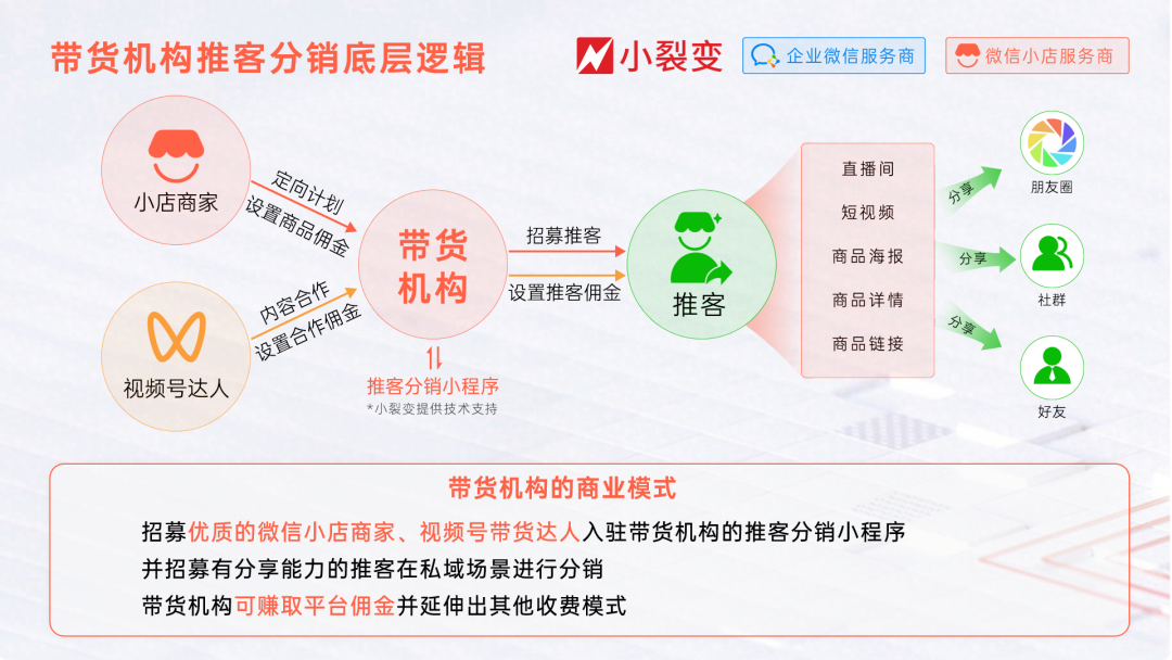 帶貨機(jī)構(gòu)只需搞定小店商家、視頻號達(dá)人、推客的運(yùn)營,即可輕松實(shí)現(xiàn)帶貨銷量暴漲。