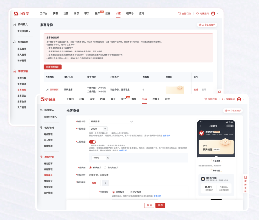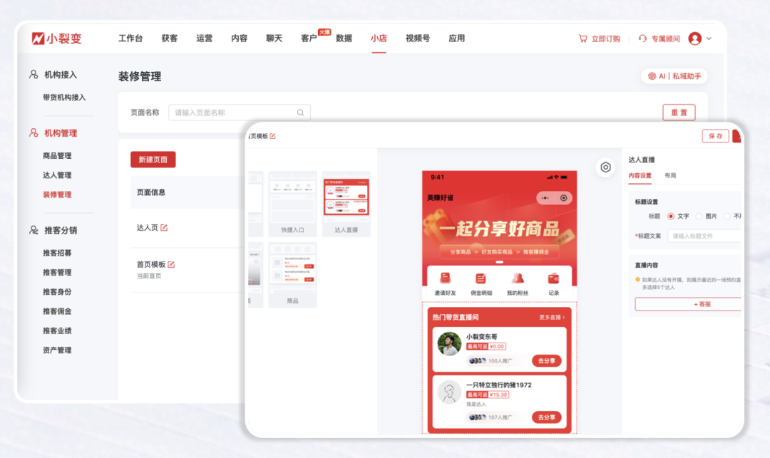 小裂變·推客分銷系統(tǒng)機(jī)構(gòu)版,旨在幫助帶貨機(jī)構(gòu)搭建自有推客分銷小程序。