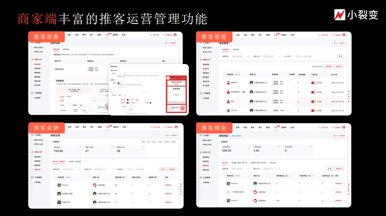支持商家版、達人版、機構(gòu)版獨立后臺,權(quán)限清晰。商家可批量導入推客數(shù)據(jù),達人可實時查看傭金明細,機構(gòu)可管理旗下推客團隊,提升協(xié)作效率。
